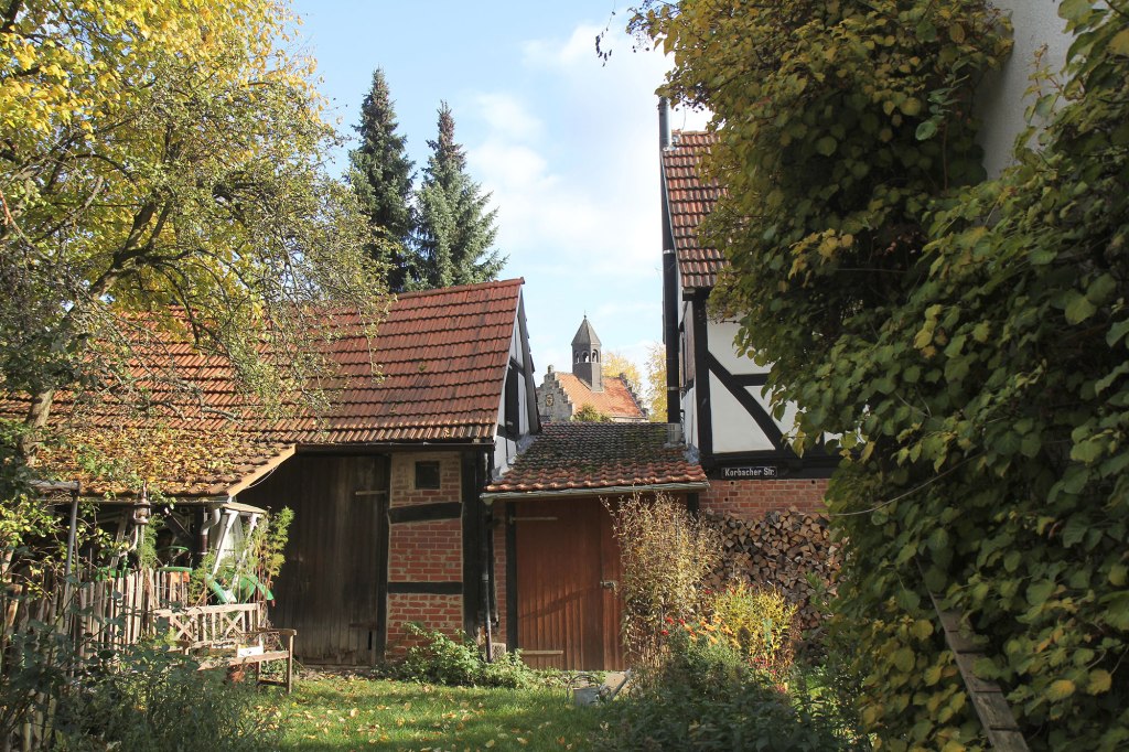 3. Wegachse vom Gemeindehausvorplatz über die Straße „Am Klosterhof“ in den Klostergarten hinein mit einem durch einen Zentralbaum markierten Sitzplatz. Die Kirchmauer wird geöffnet, im Straßenbereich wird die Wegführung durch entsprechende Pflasterung sichtbar gemacht, der Zugang zum Klostergarten wird durch einen Rosenbogen mit Holztür betont. Im Zuge der Wegführung werden eine Strom- und Frischwasserleitung vom Gemeindehaus in den Klostergarten geführt.